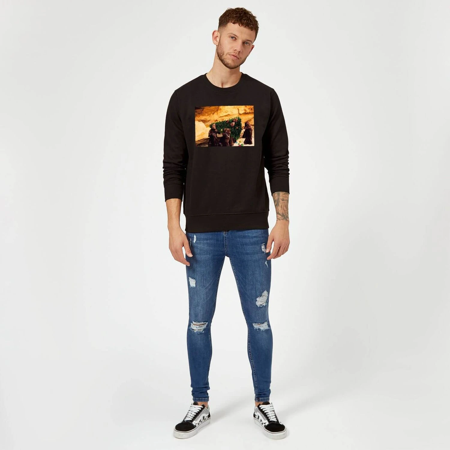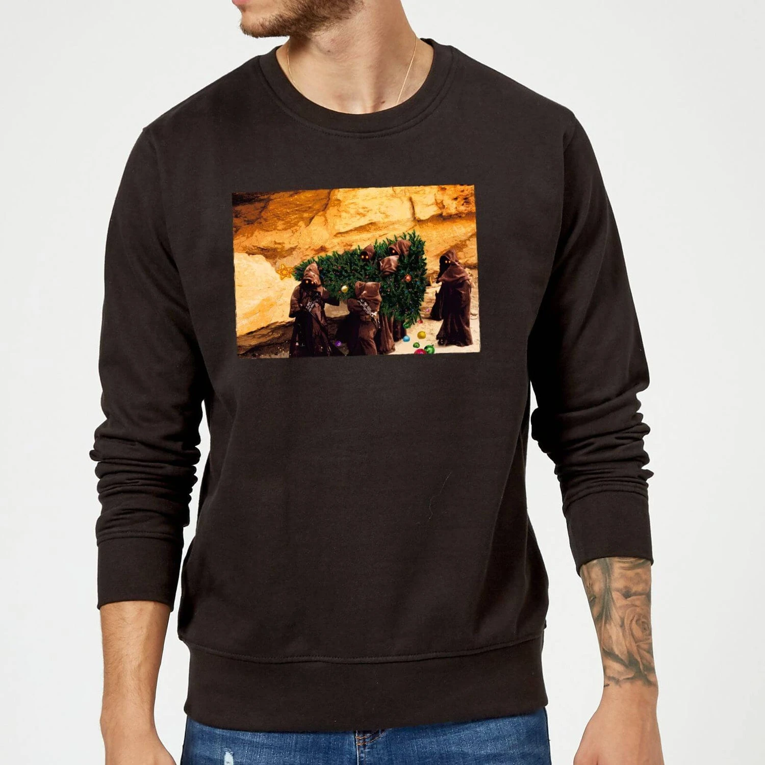 The Star Wars Jawas Christmas Tree Black Christmas Sweatshirt, which is brimming with style, is only available on our site.